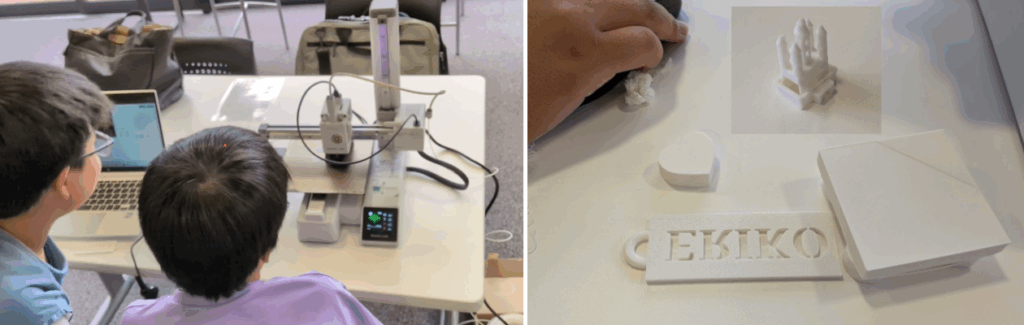 お名前プレートをつくるつもりでしたが、結局作りたいものを作ることになりました。コマを作っては失敗し、フィラメントが絡んで悪戦苦闘しながら、試行錯誤して作品作りをしました。プリントして動いていると思わず見入ってしまいますね。自宅でTinkercadで作品作りをして、次回データを持ってくるそうですよ